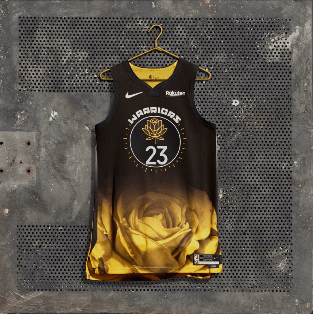 My eyes just jump straight to the insane golden rose at the bottom of the jersey. It’s giving when you are in middle school and you think that gold platted things are the coolest thing in the world and you just google like ‘gold plated Lambo’ or ‘gold IPhone’. Also the whole rose part can’t really be seen when the jersey is worn because players have to tuck their jerseys in. So like, whats the point of this huge ugly thing? Have mercy on the middle school teachers of the Bay Area who are going to have to see this everyday. I hate to say that I do actually kind of like the rose logo and the circle in the middle but it just gets lost.