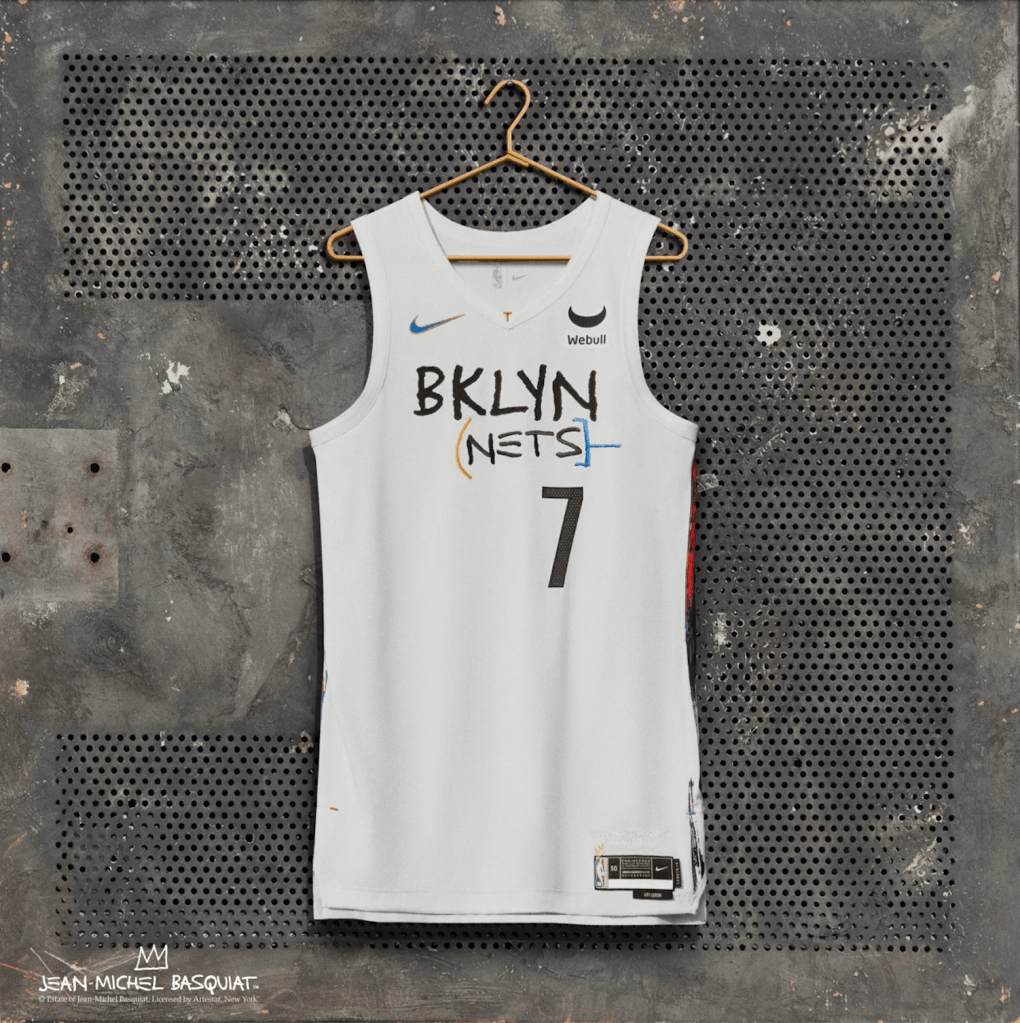 For my eyes, the Basquiat homage is obvious and well done. The Jersey manages to incorporate Basquiat’s style without violating the Nets’ colors or clean aesthetic. Chef’s kiss.